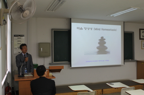 ▶ 내용: 2013년 10월 10일(목), 원광대 교학관 302강의실에서 박병림 교수(원광대 신경생리학과, 일반연구원)의 “마음항상성(Mind Homeostasis)이란 무엇인가”라는 주제의 발표가 있었다. 생명체는 생명현상을 유지하기 위하여 내부 환경을 일정하게 유지하는 신체항상성(physical homeostasis)을 가지고 있으며 이 항상성의 파괴는 질병 혹은 죽음을 조래한다. 많은 질병이 마음으로부터 초래되는데 정신-생리신경로(paycho-physiological pathway)에 의하여 설명할 수 있다. 이러한 현상은 마음항상성과 생리 항상성의 깊은 연관이 가지고 있음을 뜻한다. 인체에서 생명현상에 관여하는 생리적 기능은 항상성에 의해 유지되는데 이를 마음과 구별하여 생리 항상성(physiological homeostasis)라 한다. 신체의 생리적 기능이 항상 일정하게 유지되면 마음 또한 일정 범위내의 생리적 환경하에서 조절되는데 이를 마음 항상성(mind homeostasis)이라 정의할 수 있다. 마음 항상성을 증진시키기 위한 방법으로는 좋은 생각, 건강한 신체 가꾸기, 명상과 같은 자기 성찰을 갖는 것이다.