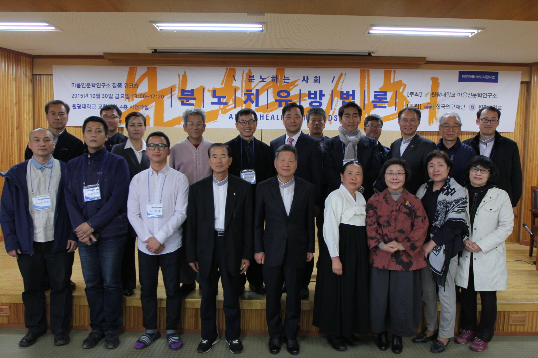 ▶ 내용: 마음인문학연구소에서는 2015년 10월 30일(금), 원광대학교 교학대학 시청각실(4층)에서 “분노하는 사회 – 분노치유방법론”이라는 제목으로 집중워크숍을 가졌다. 한내창 마음인문학연구소장의 개회사에 이어 강용(한국심리상담센터 대표)의 “발달단계 분노표출 특성 연구”, 주성완(다나을 한의원)의 “분노에 관한 한의학적 치료 방법론”의 순서로 발제가 진행되었다.