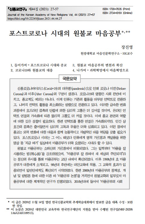 논문제목 포스트코로나 시대의 원불교 마음공부