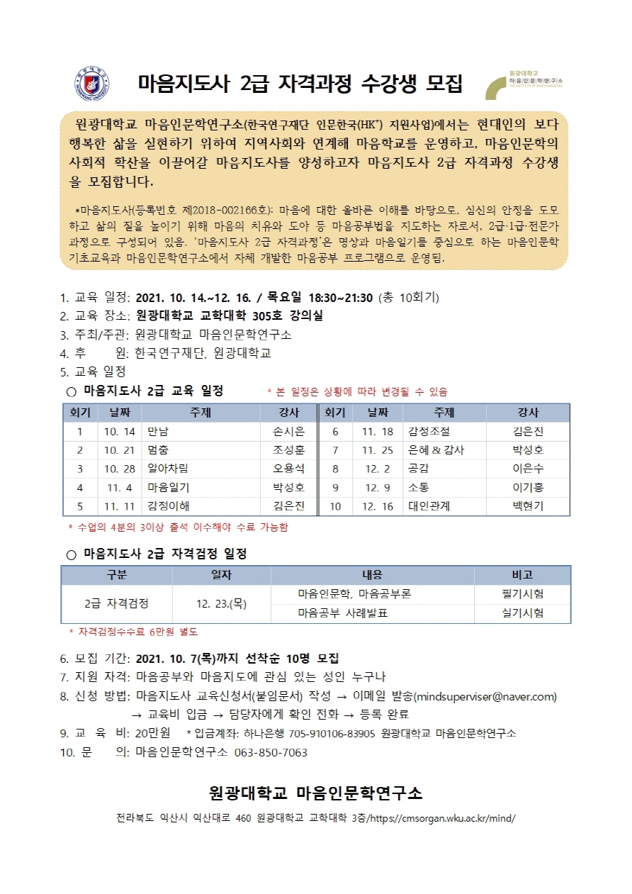 2021 익산 마음지도사 2급 자격과정 안내&교욱신청서