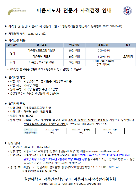 2024년 하반기 마음지도사 전문가 자격검정 안내