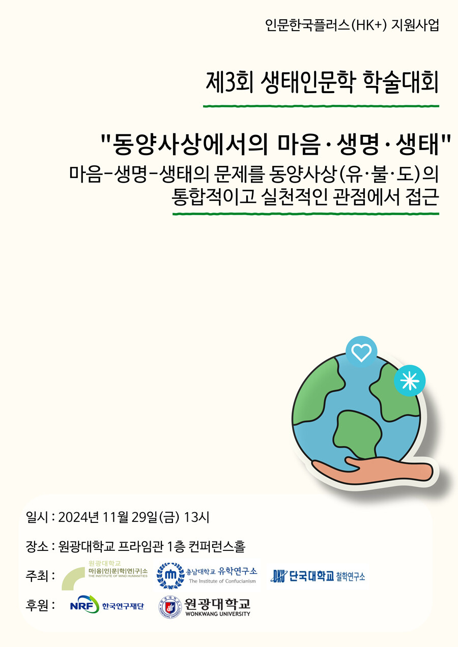 3회를 맞는 생태인문학 학술대회는 생태 위기를 극복하기 위한 인문학적 담론을 연구하고, 실천 방향을 모색하기 위한 학술교류의 장으로, 올해는 ‘동양사상에서의 마음·생명·생태’를 주제로 마음-생명-생태의 문제를 동양사상(유·불·도)의 통합적이고 실천적인 관점에서 연구한 자료들을 공유할 예정이다.
