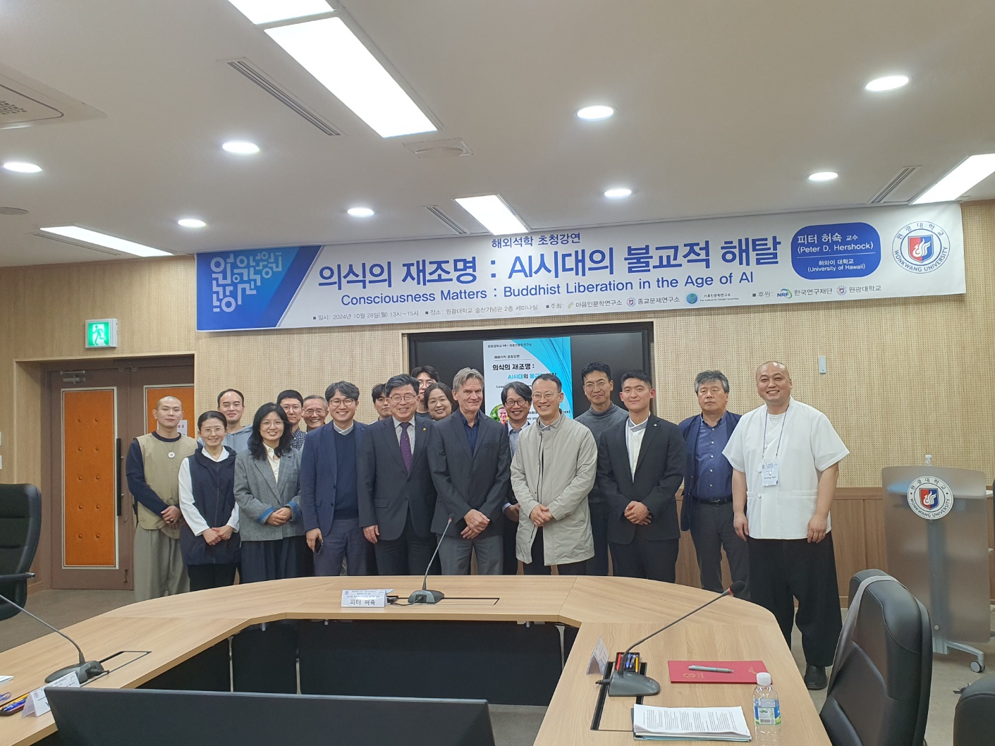 ▶ 내용: 마음인문학연구소에서는 2024년 10월 28일 “의식의 재조명: AI시대의 불교적 해탈”을 주제로 해외석학 초청강연을 진행하였다. 미국 하와이 대학교 피터 허쇽 교수가 연사로 나서 AI시대의 정신에 대한 특징을 설명하고, 이에 따른 불교적 해탈의 적용에 대한 연구 전망을 제시하였다.