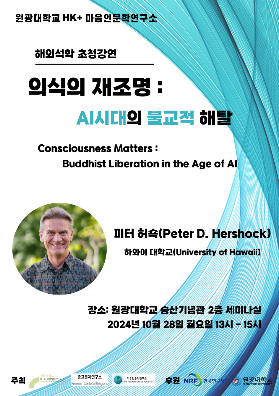 ▶ 내용: 마음인문학연구소에서는 2024년 10월 28일 “의식의 재조명: AI시대의 불교적 해탈”을 주제로 해외석학 초청강연을 진행하였다. 미국 하와이 대학교 피터 허쇽 교수가 연사로 나서 AI시대의 정신에 대한 특징을 설명하고, 이에 따른 불교적 해탈의 적용에 대한 연구 전망을 제시하였다.