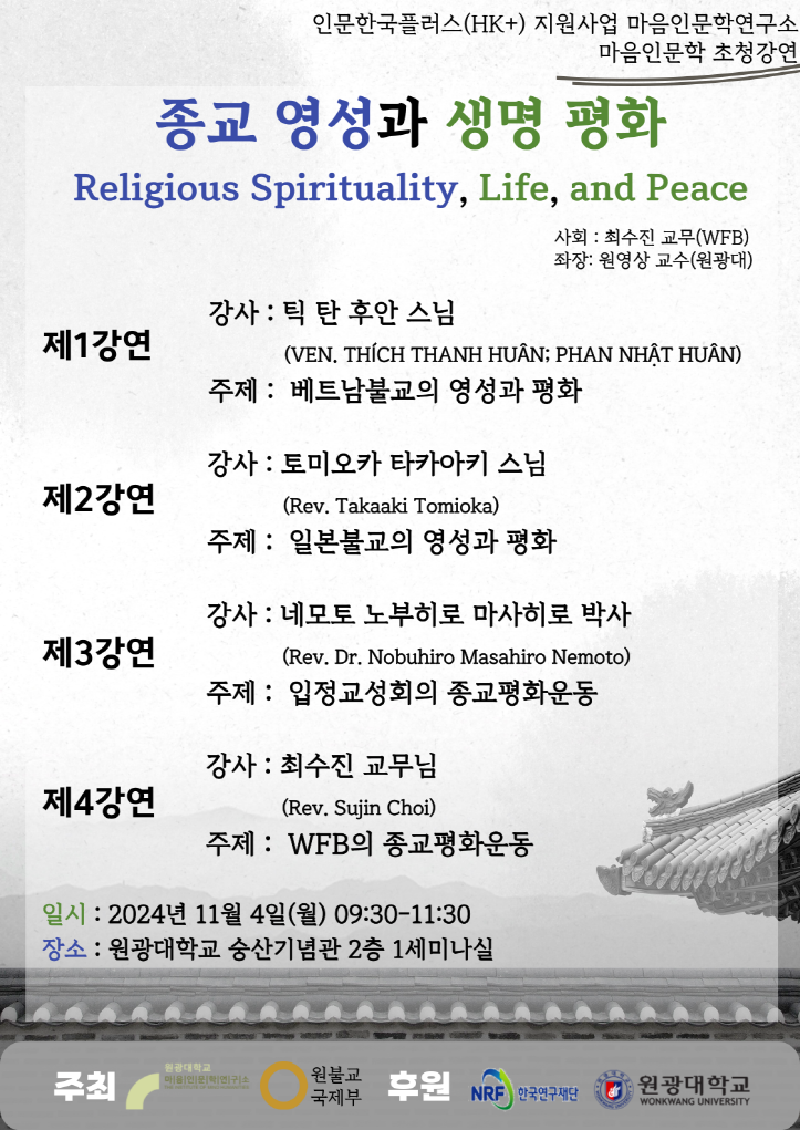 ▶ 내용: 마음인문학연구소에서는 2024년 11월 4일 “종교 영성과 생명 평화”를 주제로 해외석학 초청강연을 진행하였다. 베트남의 틱 탄 후안 스님, 일본의 토미오카 타카아키 스님과 네모토 노부히로 마사히로 박사, 그리고 최수진 교무가 연사로 나서 종교 영성과 생명 평화가 어떻게 연결될 수 있으며, 현재 어떤 의의를 지닐 수 있을 것인지에 대한 전망을 제시하였다.
