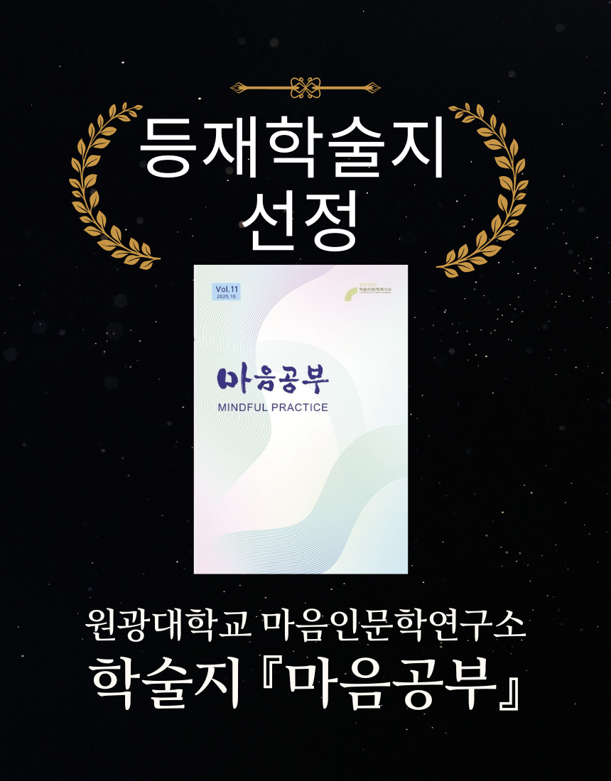 이번 한국연구재단 등재지 선정은, 원광대학교의 건학정신 실현을 위해 원광대학교 마음인문학연구소가 지향해 온 ‘마음공부의 사회화’, 즉 ‘마음공부’에 대한 학술적 담론을 사회적으로 확산하는 공적 학술 플랫폼으로서 『마음공부』가 한 단계 더 도약하는 계기가 되었습니다.